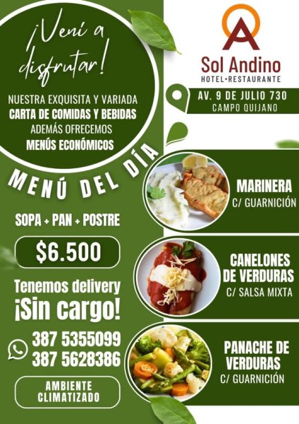 Hotel Restaurante Sol Andino Campo Quijano, Av. 9 de Julio 730. Vení a disfrutar nuestra exquisita y variada carta de comidas y bebidas. Además ofrecemos menús económicos.