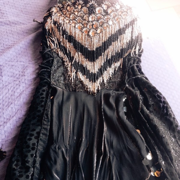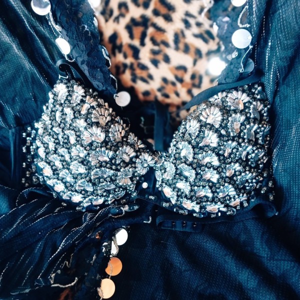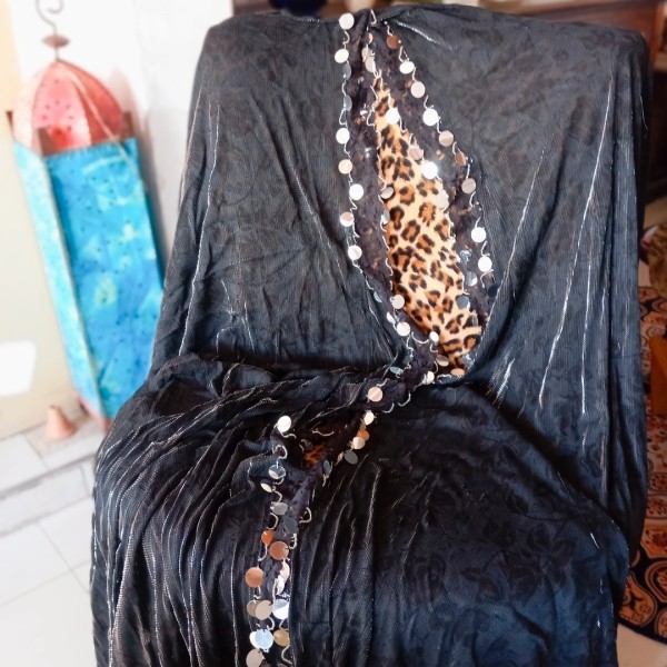 Traje árabe "Layla". Este impresionante conjunto incluye una capa mileia dobles lentejuelones hipnotizantes. El brassier, en piedras abanicos, resalta sofisticación. La falda,con telas de seda y laminado plateados, para deslumbrar en cualquier ocasión